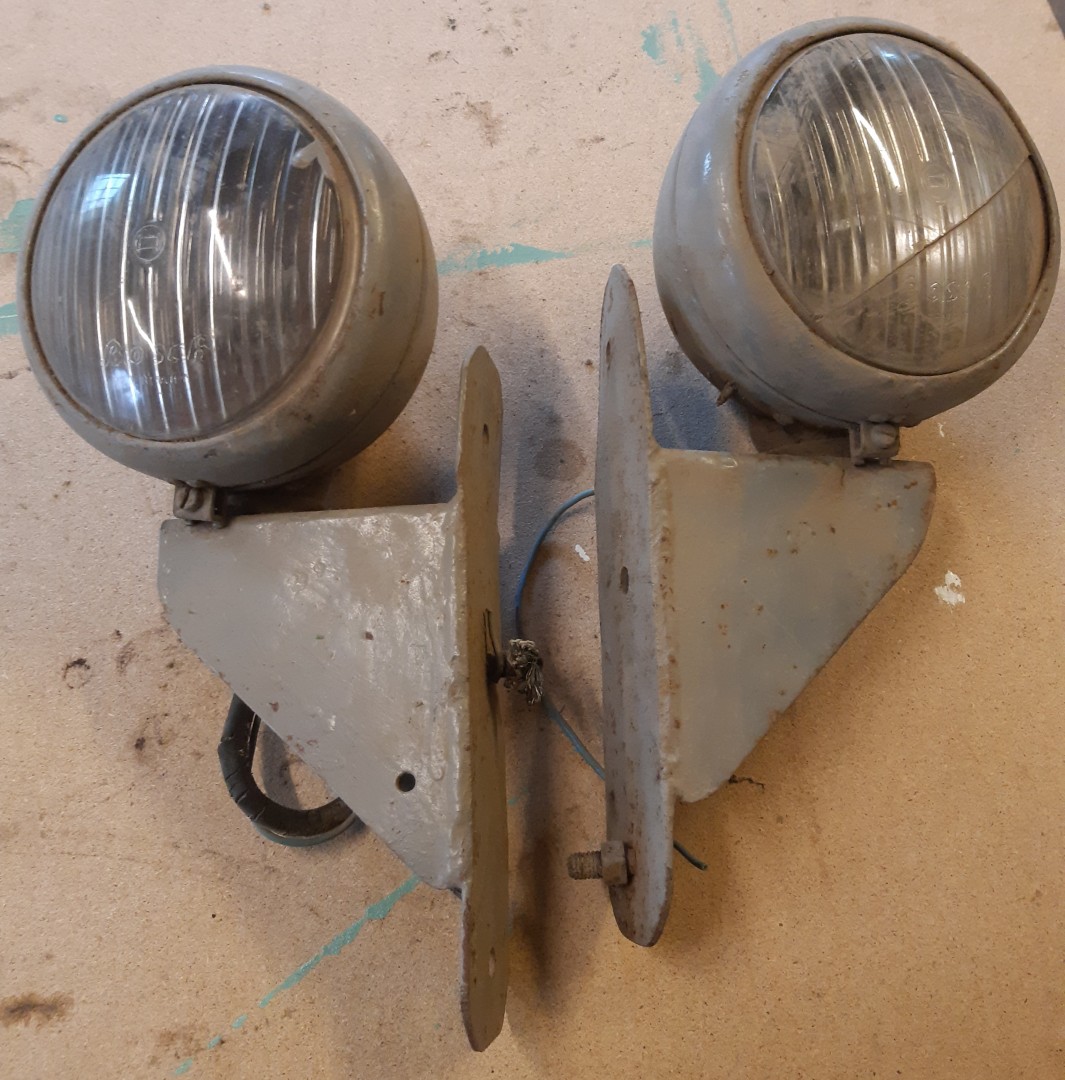 Ferguson forlygter med beslag, pillet af en årgang 48, det ene glas revnet, 2 stk. kr. 200,-